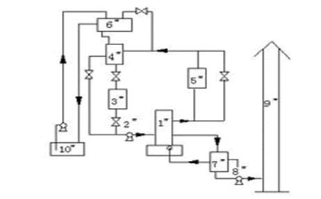 1 導(dǎo)熱油爐 2 熱油泵 3 過(guò)濾器 4 汽液分離器 5 加熱用設(shè)備 6 膨脹槽 7 換熱器 8 引風(fēng)機(jī) 9 煙囪 10 導(dǎo)熱油儲(chǔ)槽